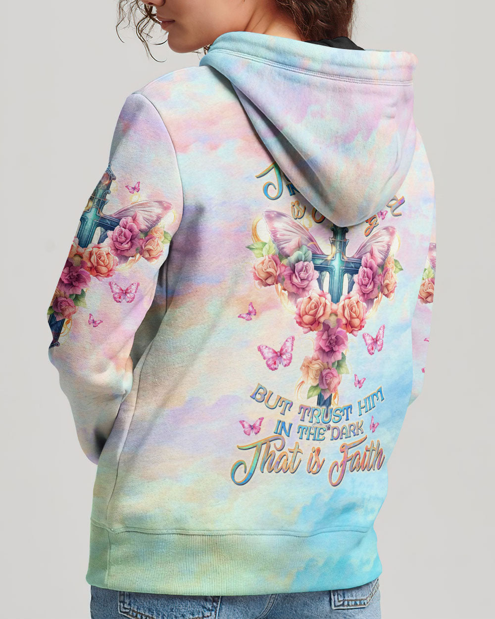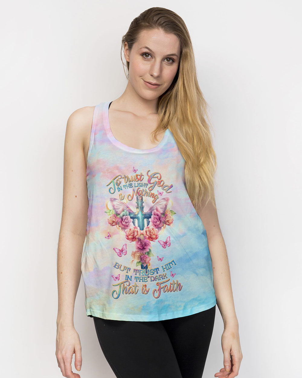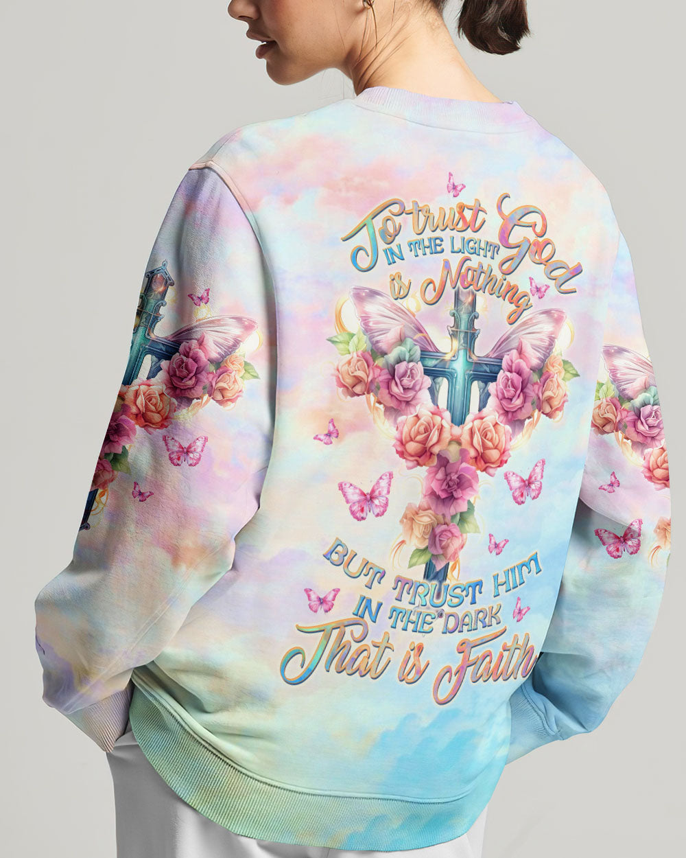 Embrace the serenity of faith with our delicate cross and rose design, awash in soothing pastel hues that symbolize your unwavering trust in Jesus and the divine strength bestowed by God. The quote, "To trust God in the light is nothing, but to trust Him in the dark... that is faith," captures the essence of steadfast belief, emphasizing that genuine faith shines brightest in life's darkest hours. It underscores the concept that placing trust in God's guidance and providence, particularly in moments of uncertainty and adversity, represents the most profound expression of faith.
