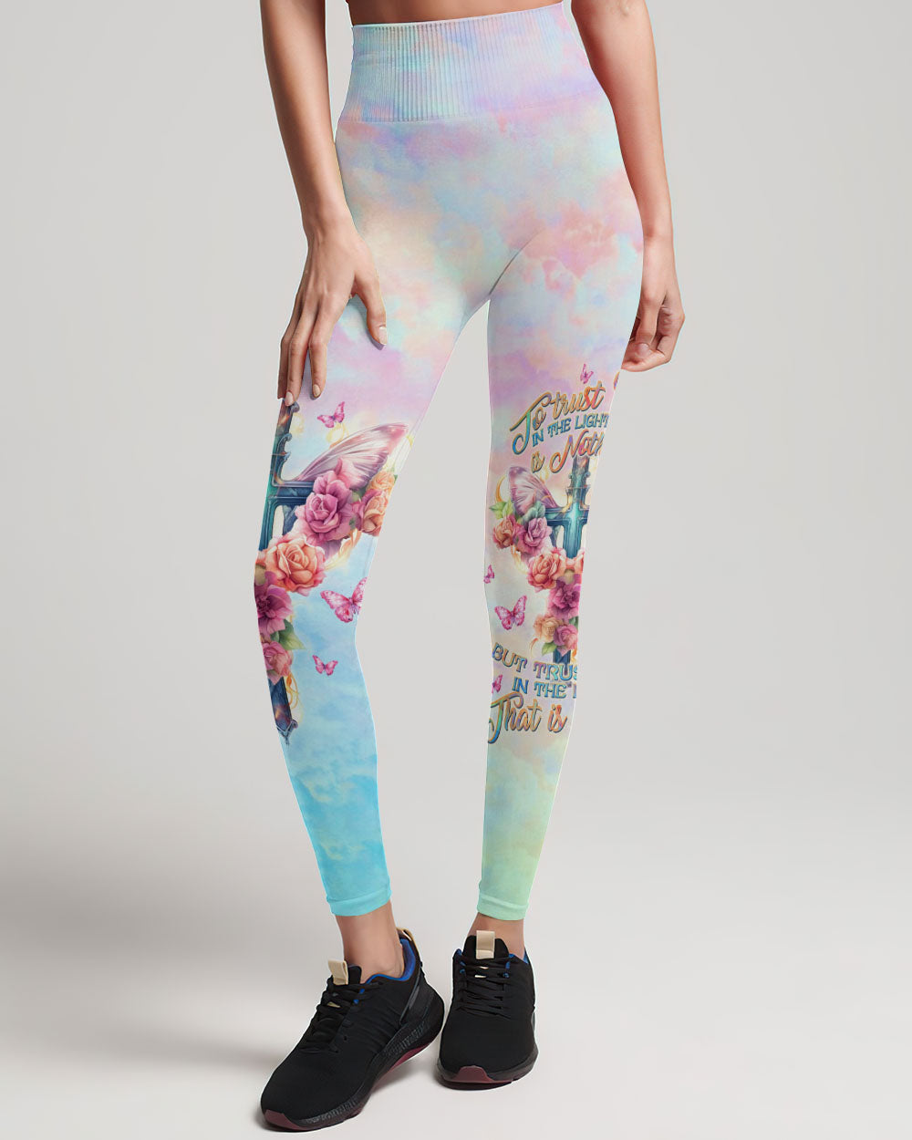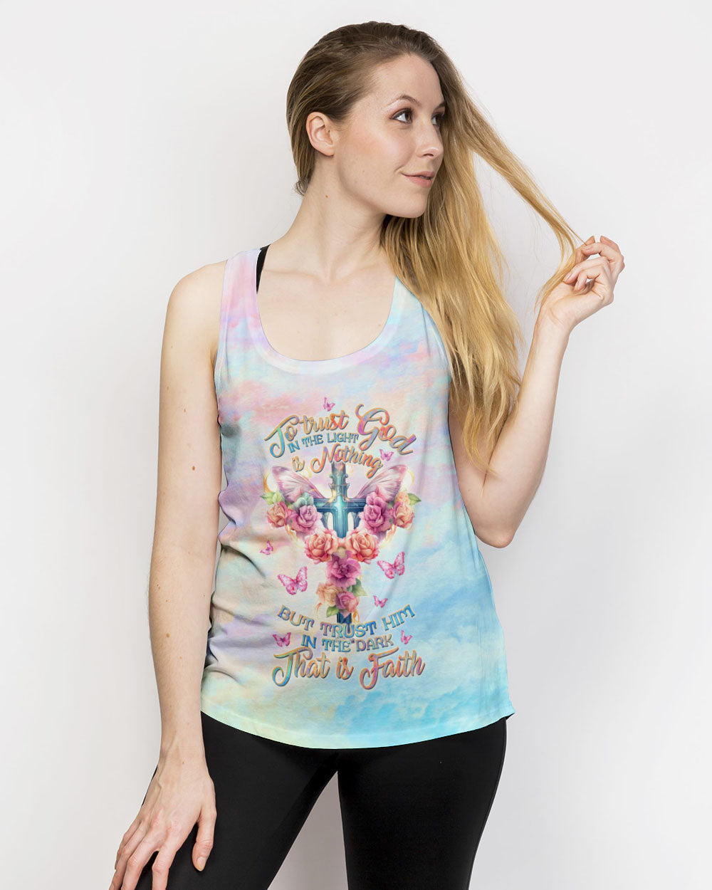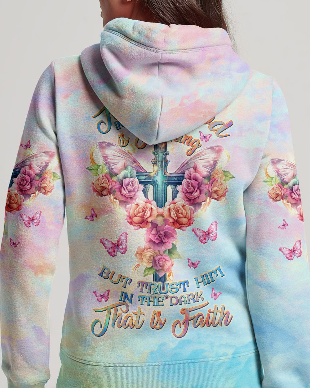 Embrace the serenity of faith with our delicate cross and rose design, awash in soothing pastel hues that symbolize your unwavering trust in Jesus and the divine strength bestowed by God. The quote, "To trust God in the light is nothing, but to trust Him in the dark... that is faith," captures the essence of steadfast belief, emphasizing that genuine faith shines brightest in life's darkest hours. It underscores the concept that placing trust in God's guidance and providence, particularly in moments of uncertainty and adversity, represents the most profound expression of faith.