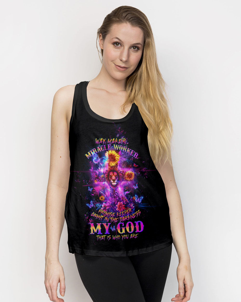 Embrace your faith with our captivating Way Maker Lion Women's All Over Print. The vibrant design featuring a cross lion and blooming flowers symbolizes devotion to Jesus Christ. The quote extolls God's unwavering attributes as a guiding force, miracle worker, and beacon of hope, reaffirming belief in His omnipotence and grace.