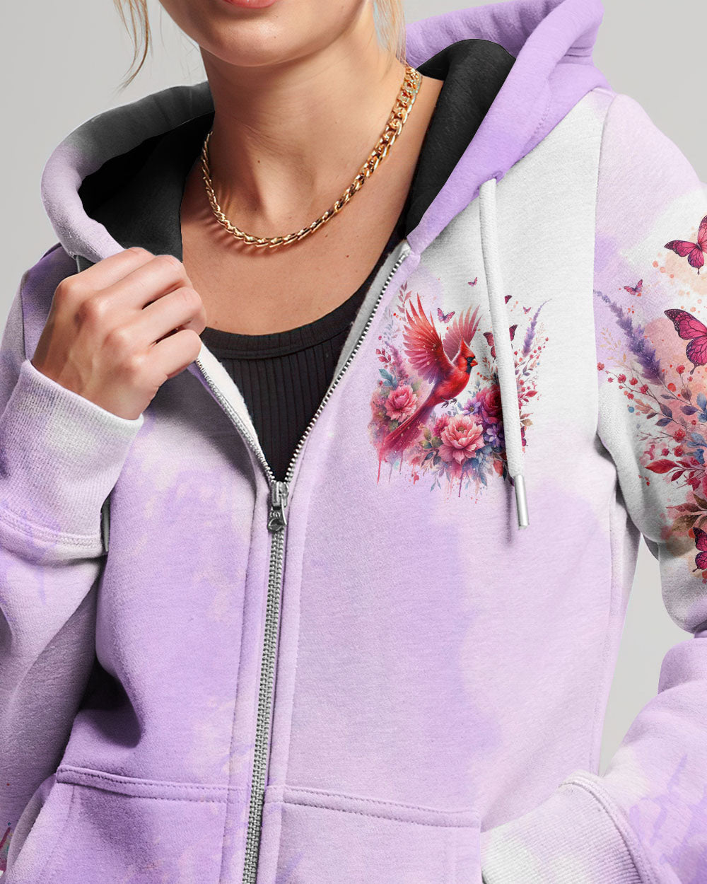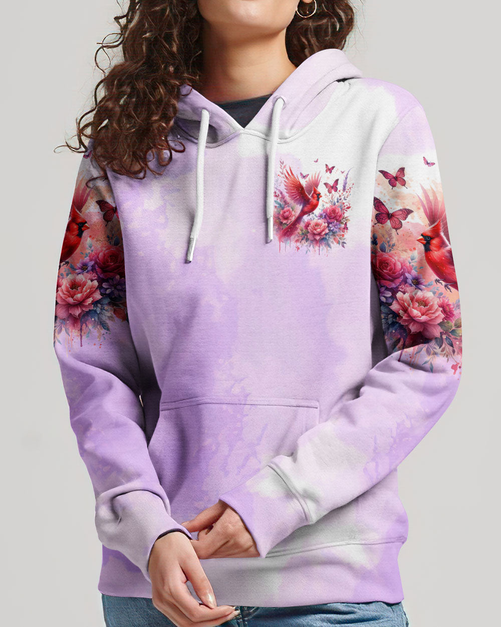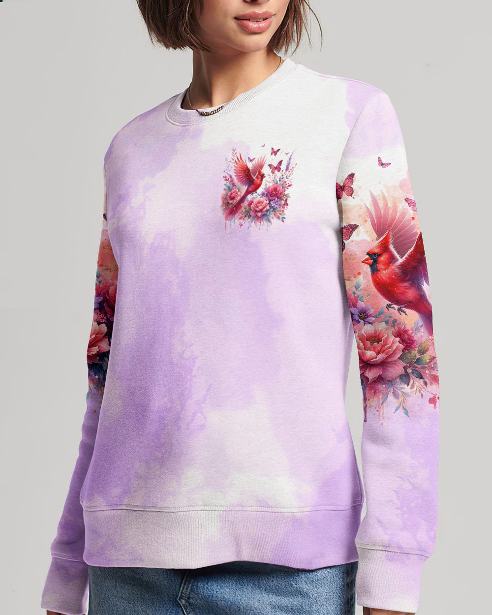 Elevate your style with our stunning red cardinal bird design, surrounded by blooming flowers, on our all-over print shirt. The inspiring quote "When Cardinals Appear, Angels Are Near" highlights the spiritual significance of the cardinal, symbolizing divine presence and guidance in moments of contemplation. A beautiful expression of faith in Jesus.