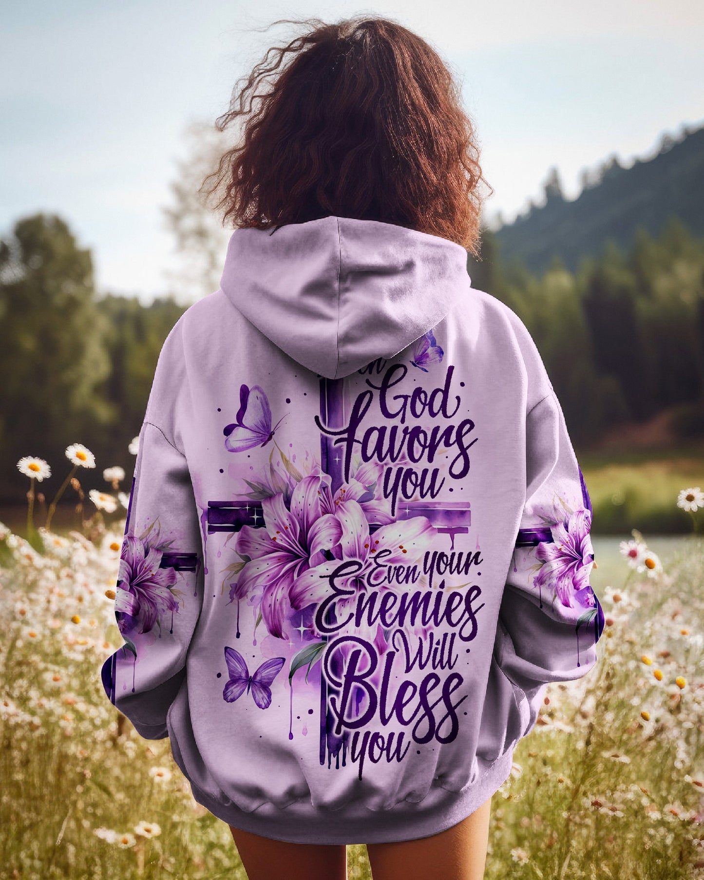 Enhance your Christian devotion with our design merging crosses, lilies, butterflies, and the impactful quote: 'When God Favors You, Even Your Enemies Will Bless You.' This fusion embodies unwavering faith and divine favor. Crosses radiate devotion, lilies symbolize purity, and butterflies signify spiritual growth, converging to create a resonant design. Prepare to be moved by the impactful message and profound depth of this remarkable creation.