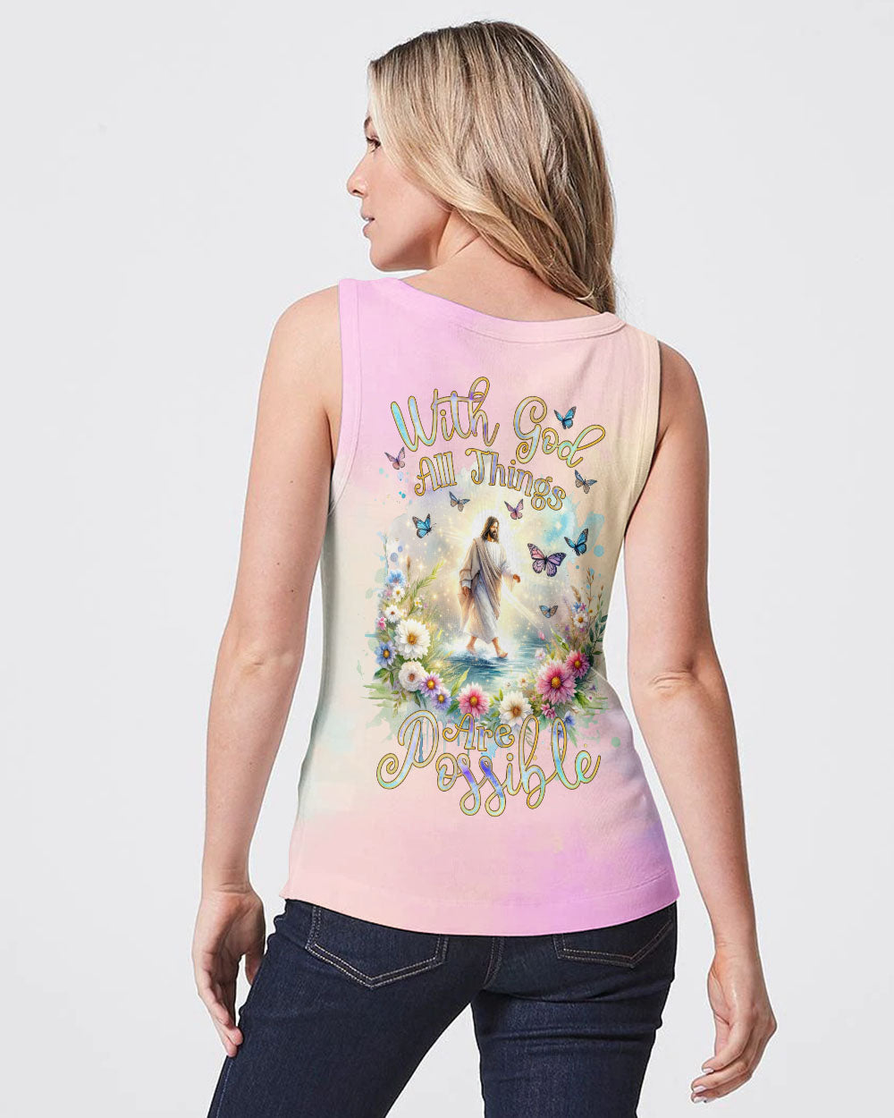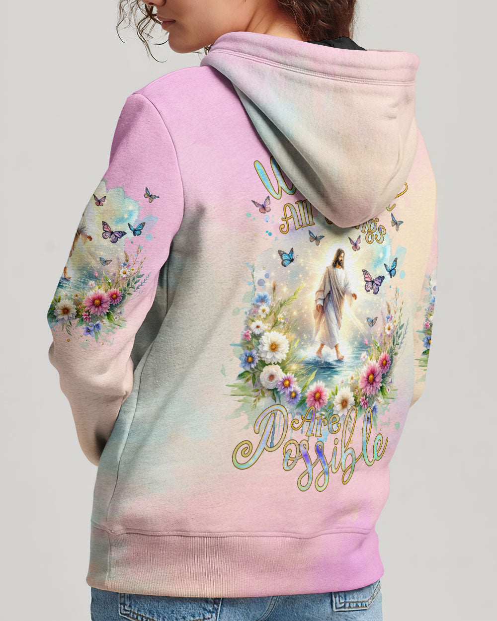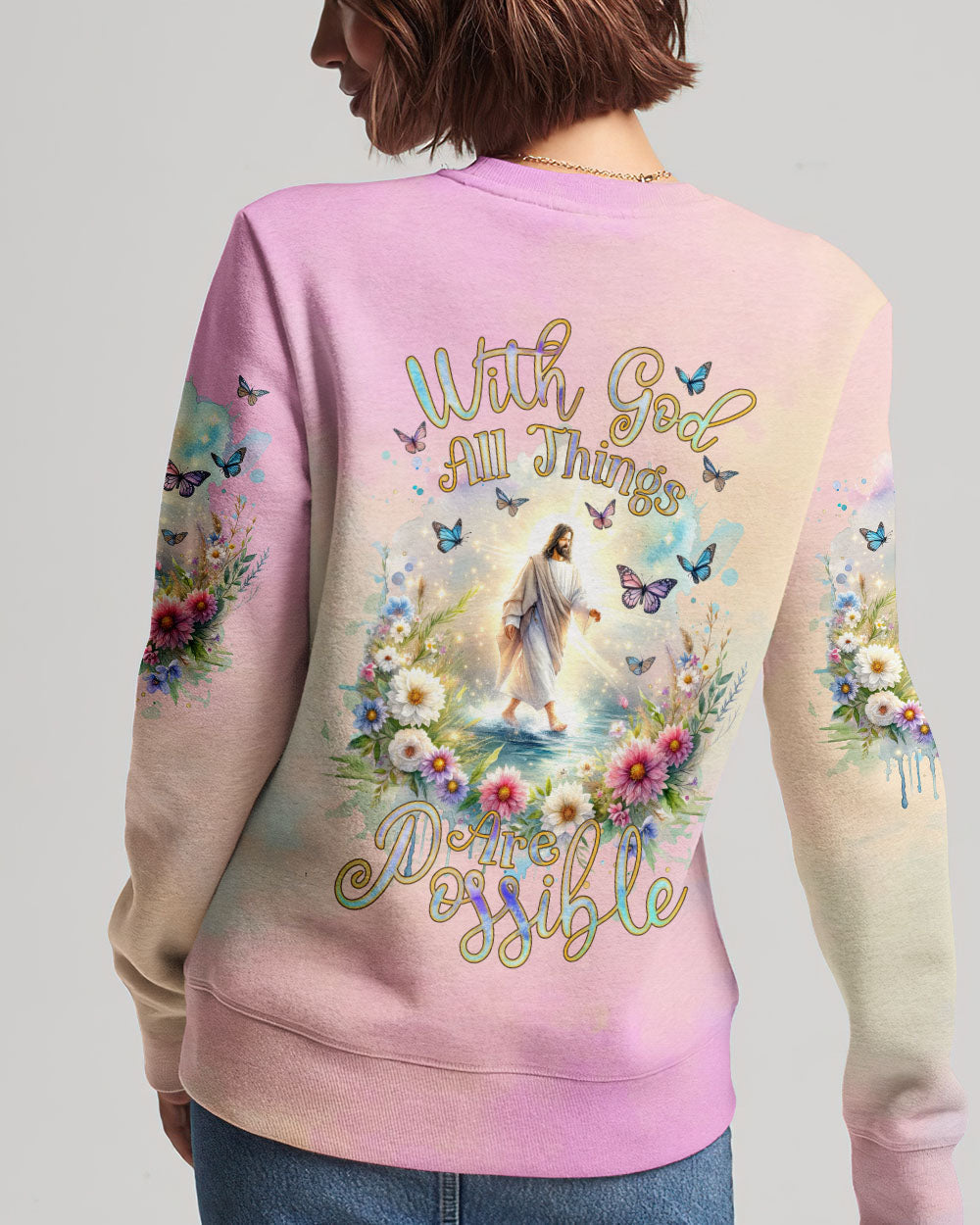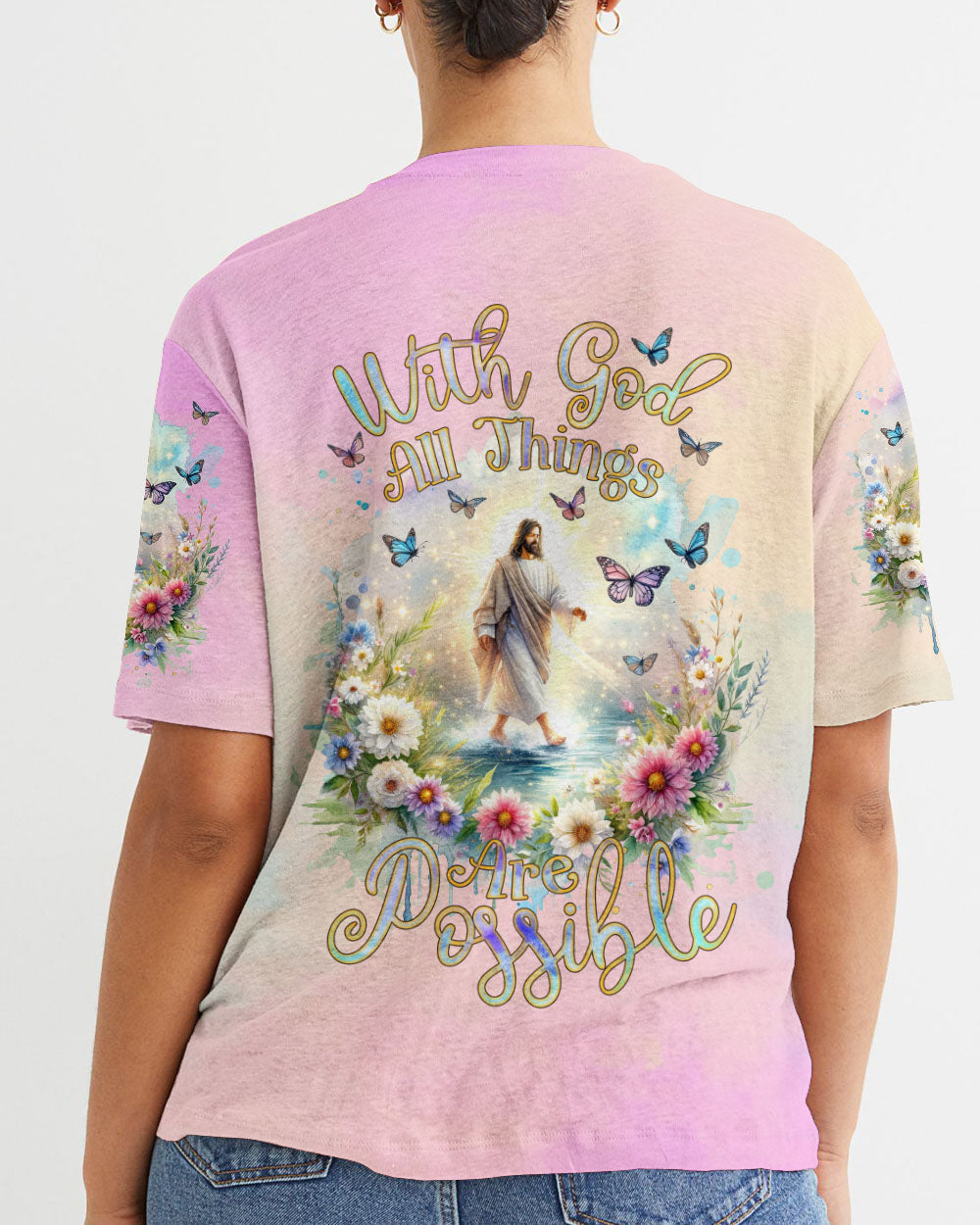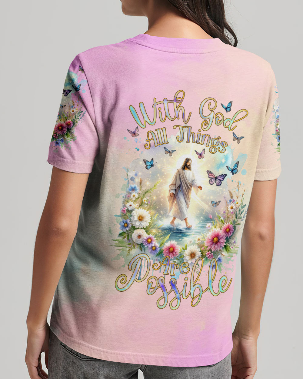 This uplifting design of Jesus walking on water amidst blooming flowers is a symbolic representation of faith. The statement, "With God, All Things Are Possible," invokes hope and a reminder that, through unwavering faith, challenges can be conquered and miracles can unfold. Experience the profound beauty of faith with this captivating all-over print shirt.