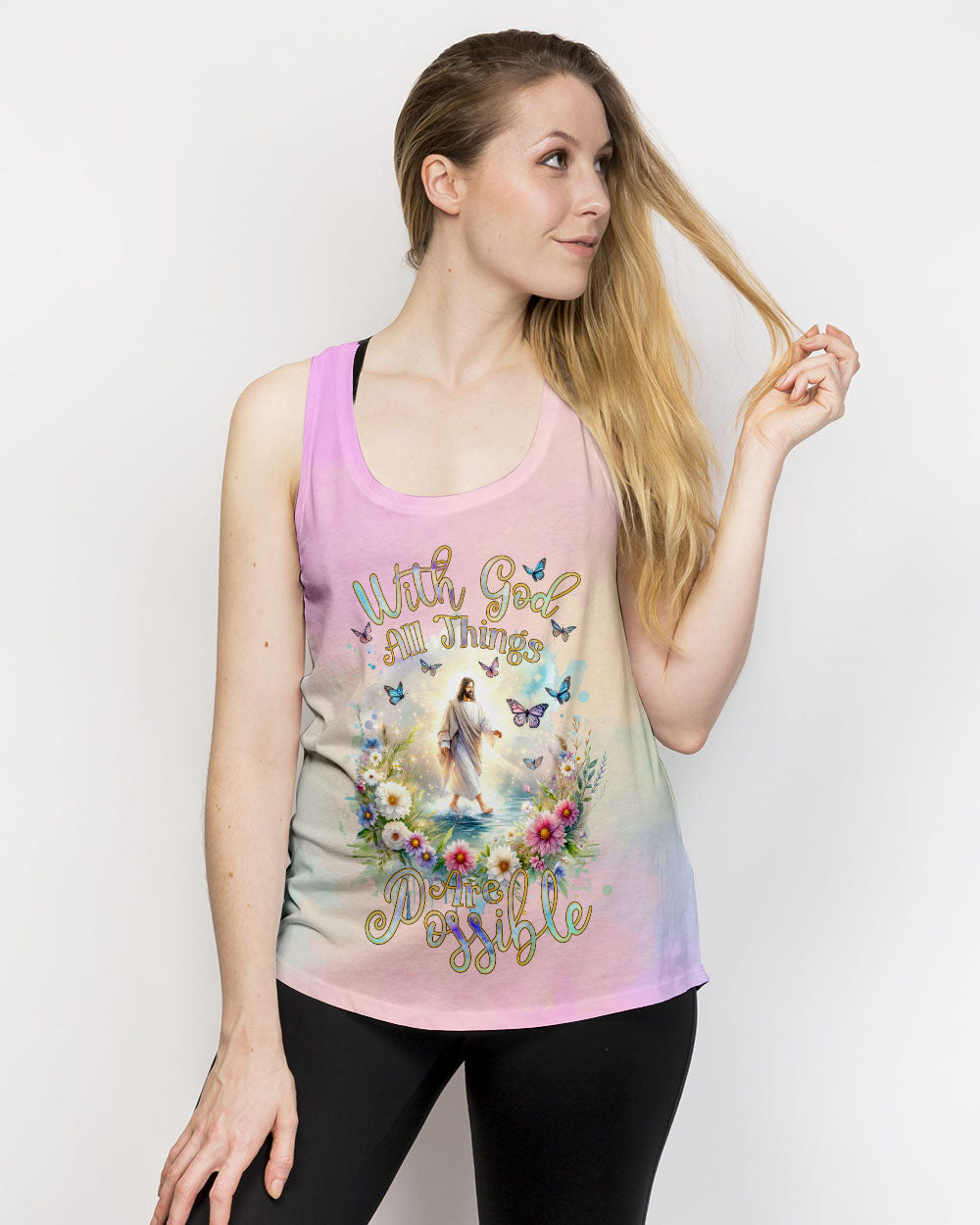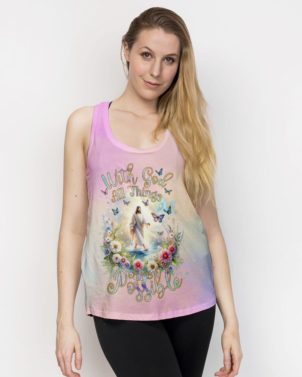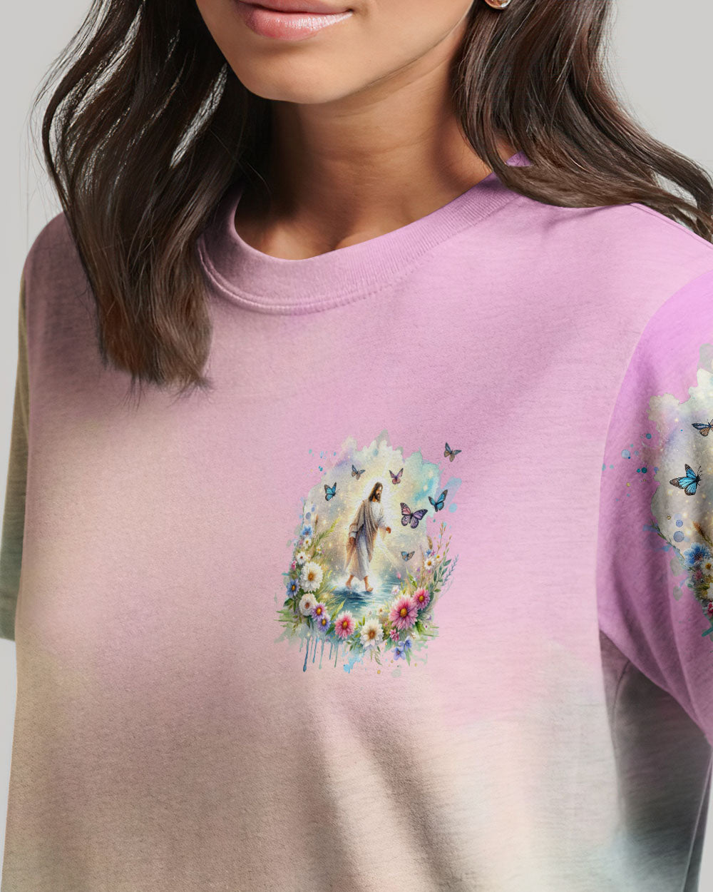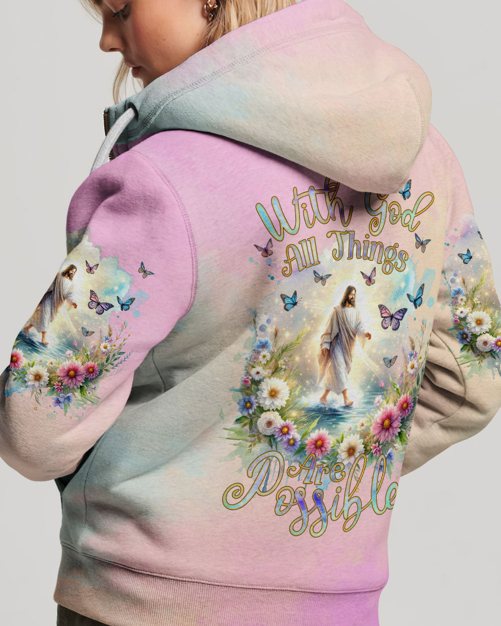 This uplifting design of Jesus walking on water amidst blooming flowers is a symbolic representation of faith. The statement, "With God, All Things Are Possible," invokes hope and a reminder that, through unwavering faith, challenges can be conquered and miracles can unfold. Experience the profound beauty of faith with this captivating all-over print shirt.