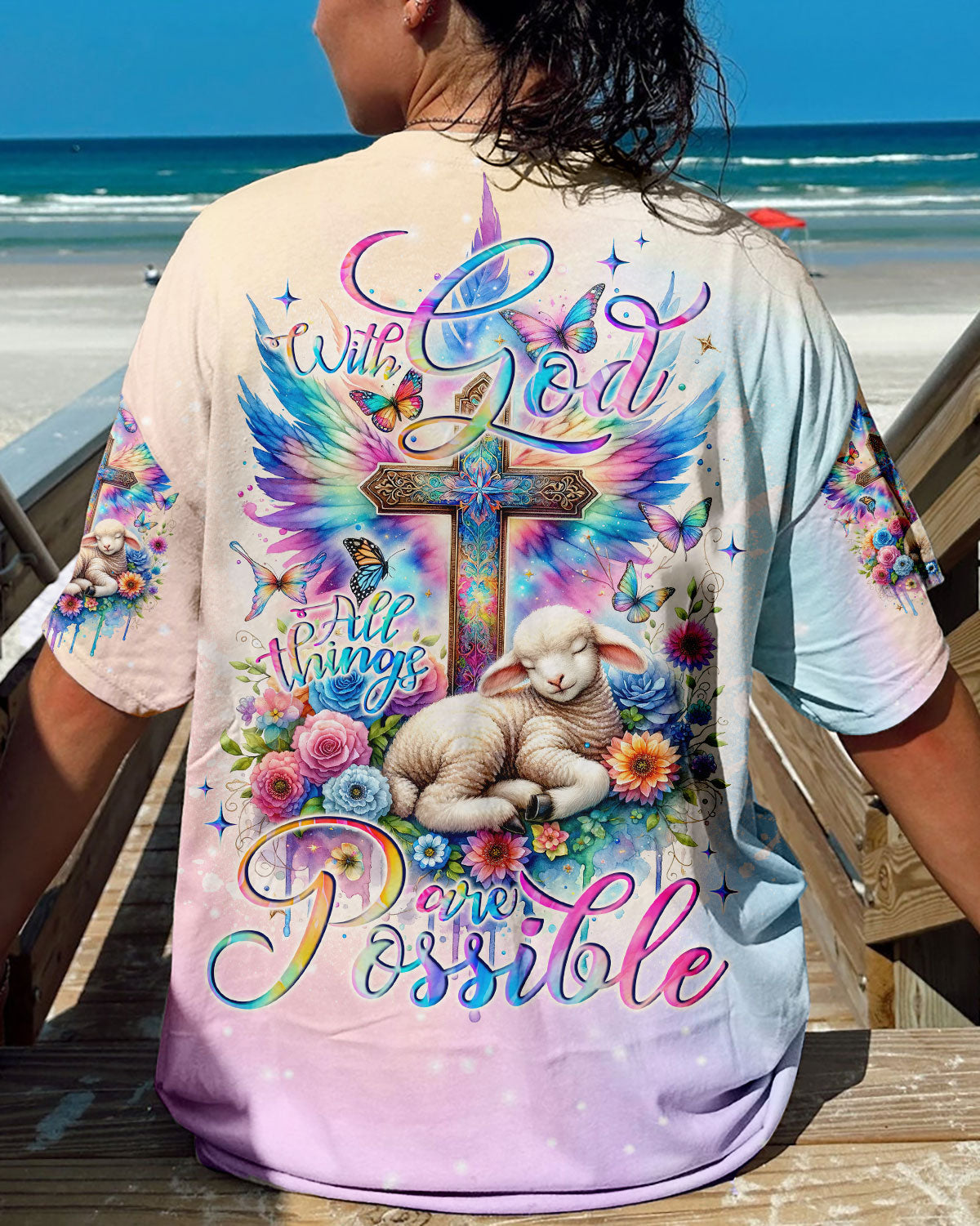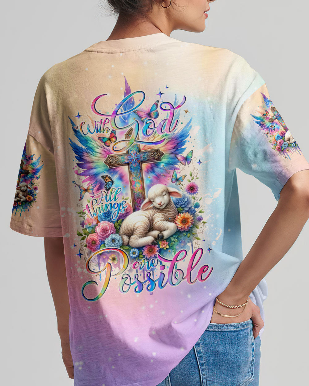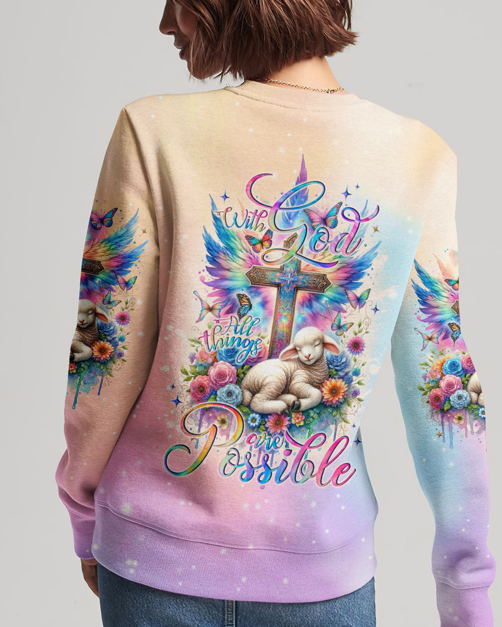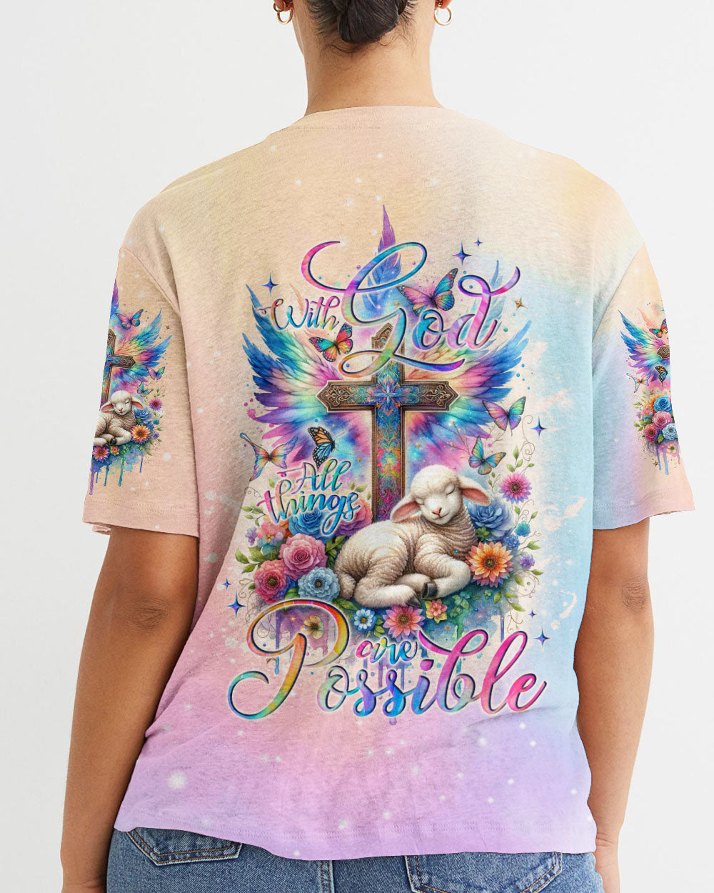 This With God All Things Are Possible Lamb Wings Women's All Over Print Shirt features a beautiful cross design with colorful wings, blooming flowers, and a peaceful lamb symbolizing the infinite strength and hope of faith. With its profound message of unwavering belief in God, it serves as a reminder for anyone going through life's challenges that faith carries limitless potential.