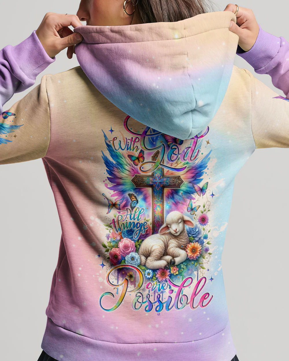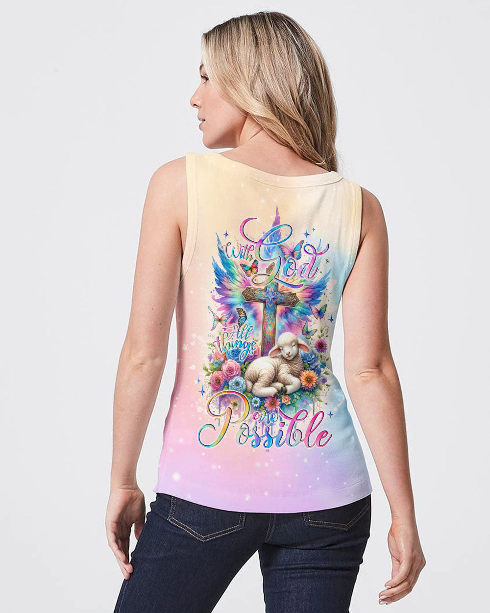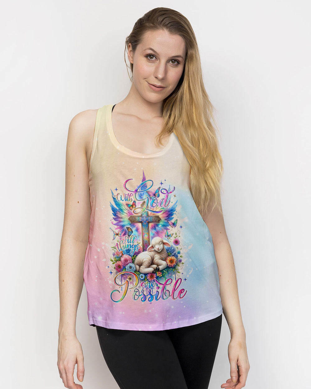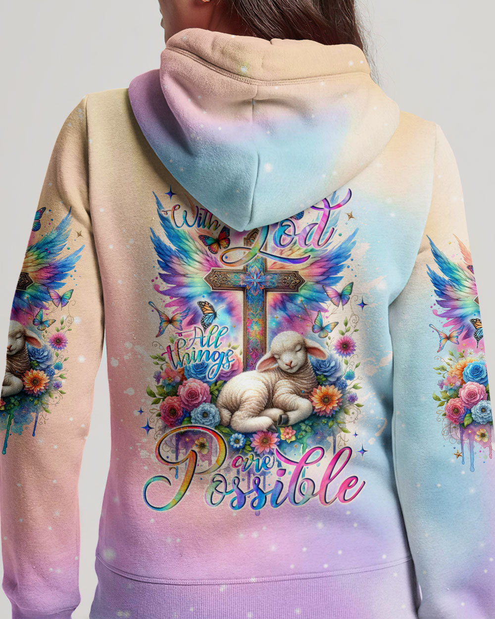 This With God All Things Are Possible Lamb Wings Women's All Over Print Shirt features a beautiful cross design with colorful wings, blooming flowers, and a peaceful lamb symbolizing the infinite strength and hope of faith. With its profound message of unwavering belief in God, it serves as a reminder for anyone going through life's challenges that faith carries limitless potential.
