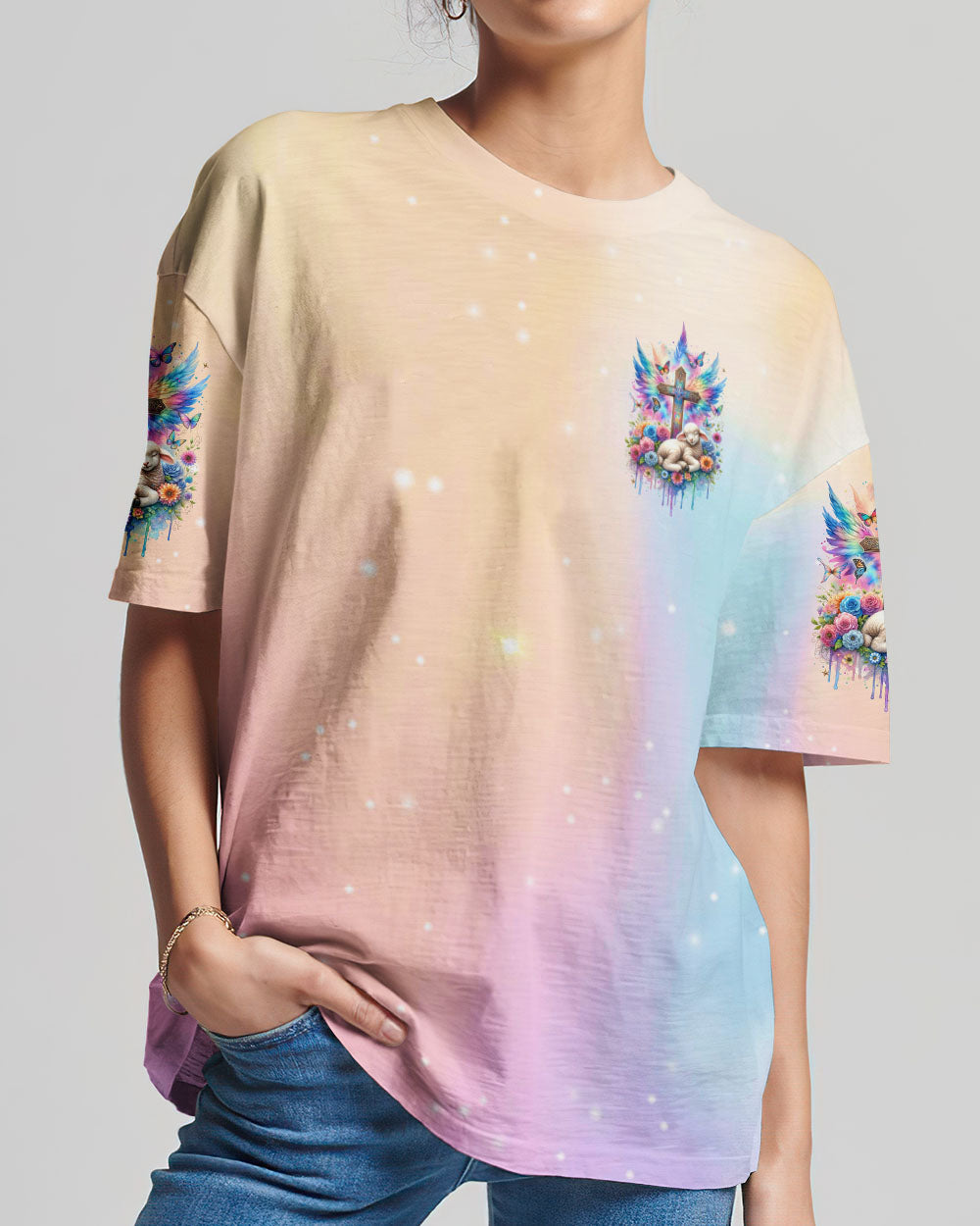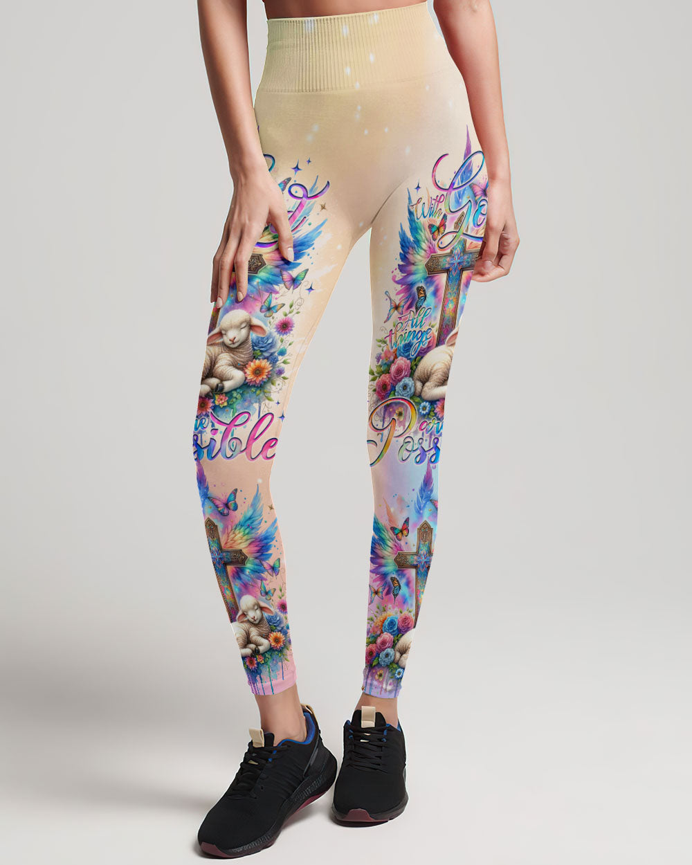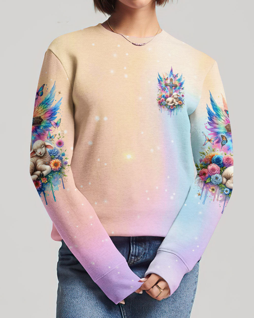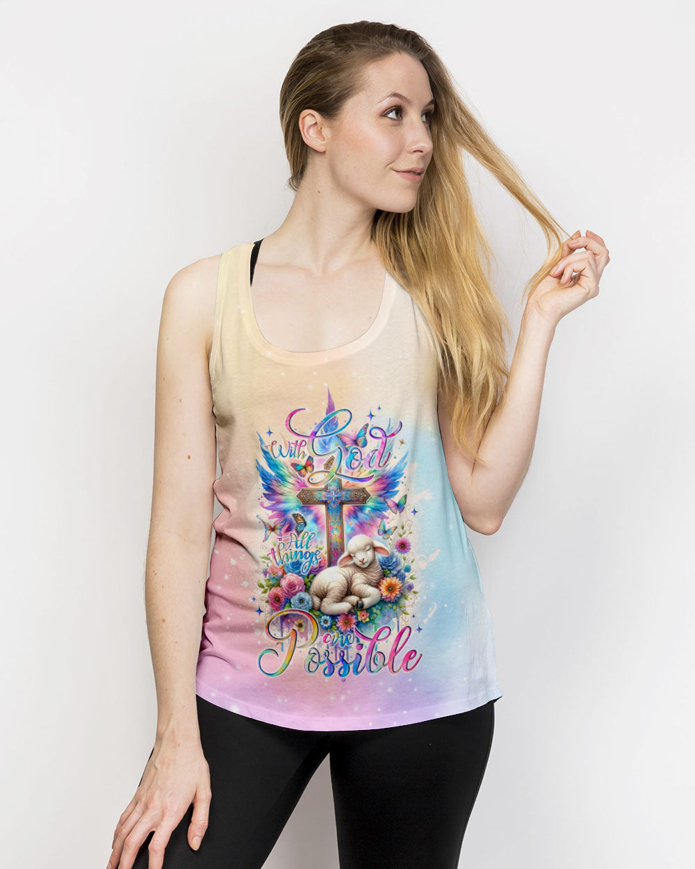 This With God All Things Are Possible Lamb Wings Women's All Over Print Shirt features a beautiful cross design with colorful wings, blooming flowers, and a peaceful lamb symbolizing the infinite strength and hope of faith. With its profound message of unwavering belief in God, it serves as a reminder for anyone going through life's challenges that faith carries limitless potential.