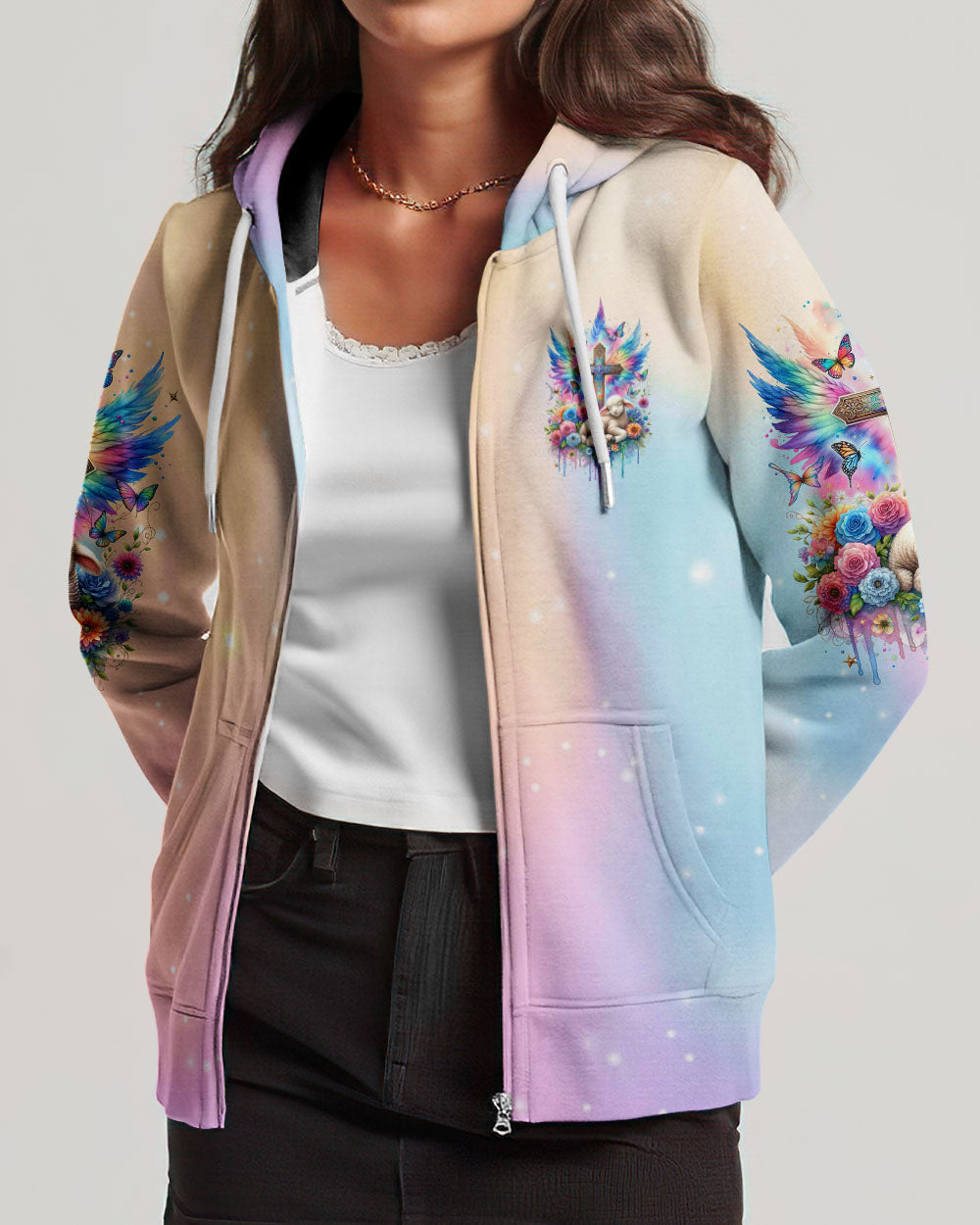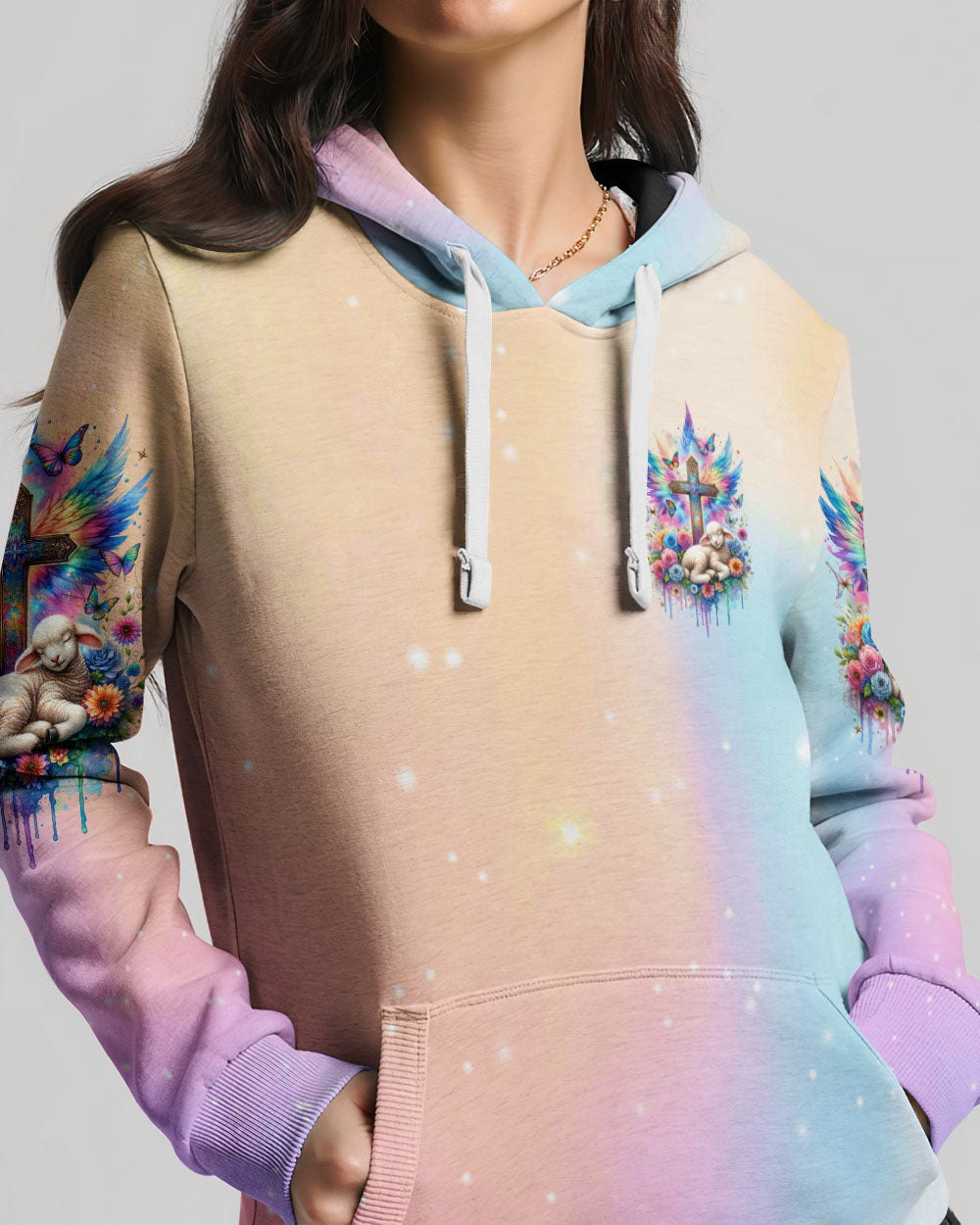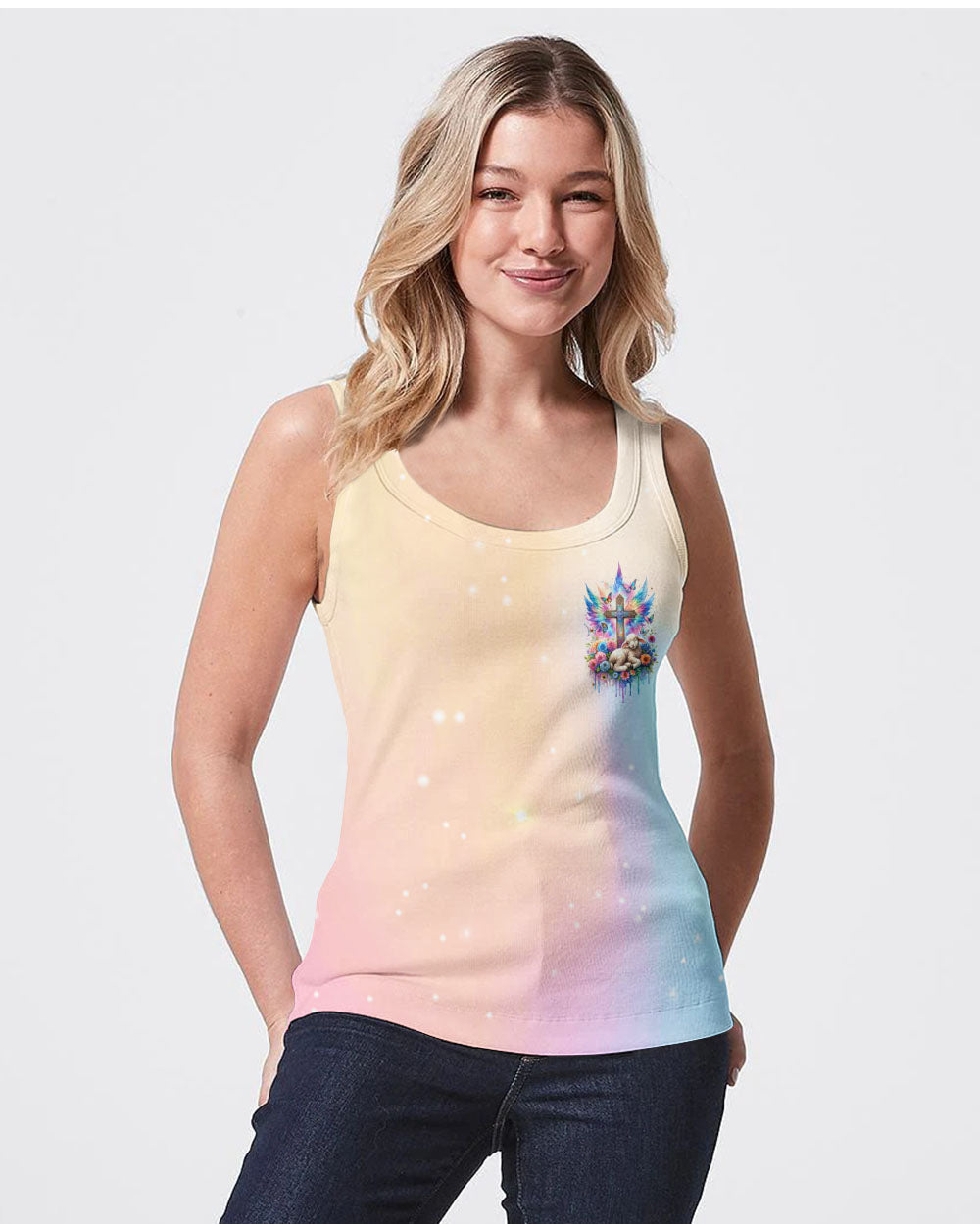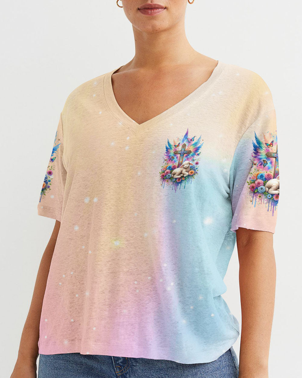 This With God All Things Are Possible Lamb Wings Women's All Over Print Shirt features a beautiful cross design with colorful wings, blooming flowers, and a peaceful lamb symbolizing the infinite strength and hope of faith. With its profound message of unwavering belief in God, it serves as a reminder for anyone going through life's challenges that faith carries limitless potential.