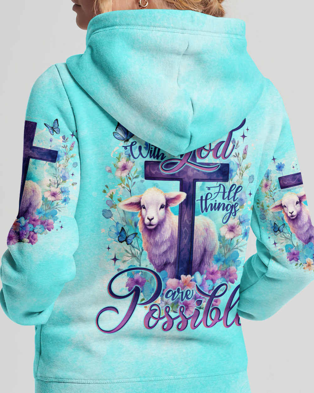This striking With God All Things Are Possible Lamb Women's All Over Print Shirt is a symbol of faith and hope. It features a beautifully crafted lamb design with a cross surrounded by blooming flowers, an evocative reminder that all things are possible with God. Let its message of limitless possibilities be a source of encouragement and strength as you wear this shirt with trust and assurance.