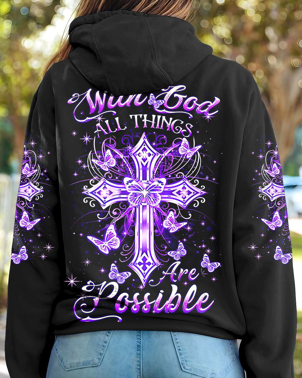 Let your faith shine with With God All Things Are Possible Women's All Over Print Shirt. Crafted with an inspiring design of a radiant purple cross and graceful butterflies, this shirt is a beautiful reminder of the power of faith and potential it offers. Made from quality material, this unique shirt will keep you comfortable and stylish. Show your faith to the world with this special design!