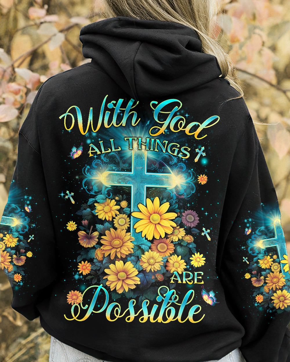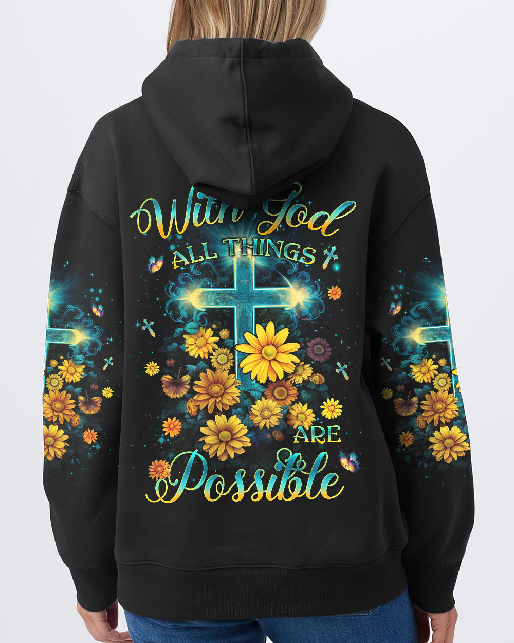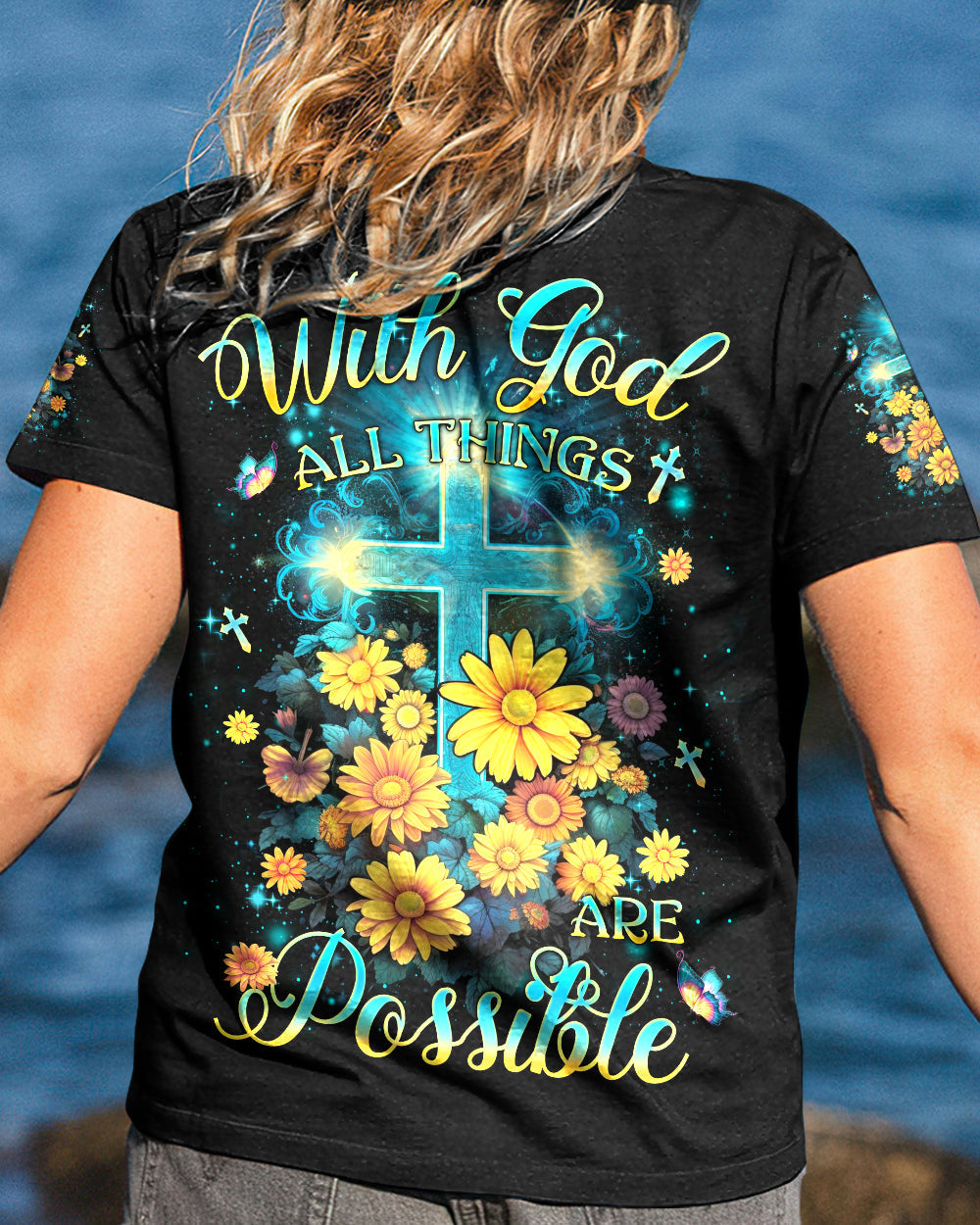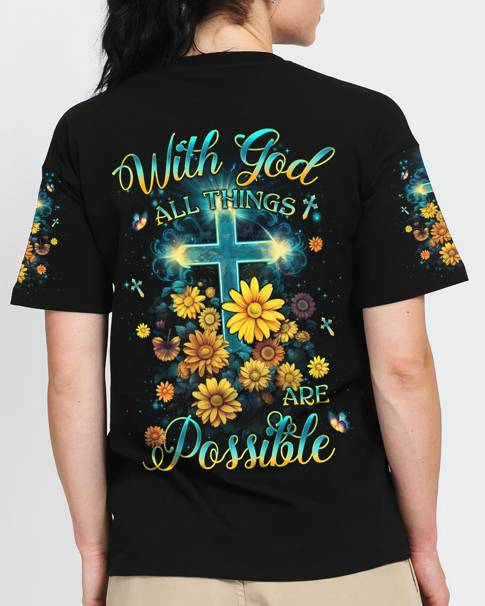 This With God All Things Are Possible Women's All Over Print Shirt features a radiant Christ design with a luminous cross adorned with sunflowers and butterflies. The profound quote, "With God all things are possible" provides a beautiful reminder of divine possibilities. Carry this symbol of faith and resilience with you and let your belief in the extraordinary shine brightly!