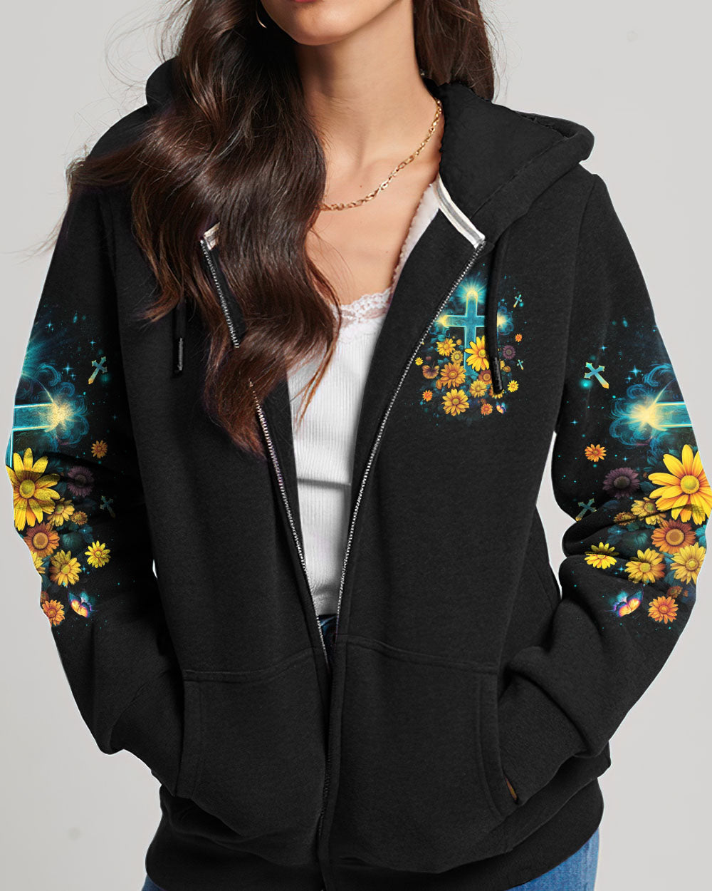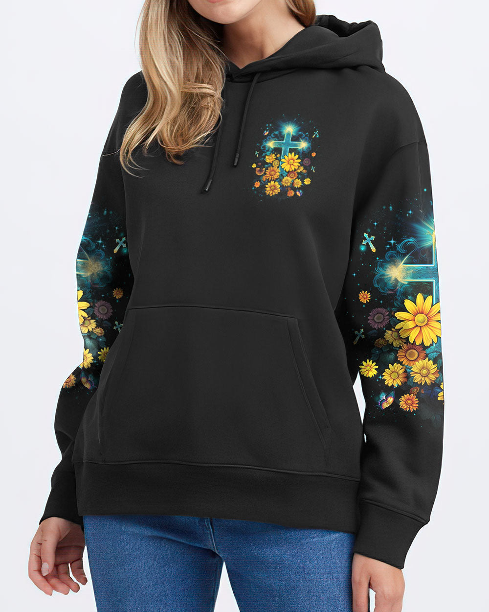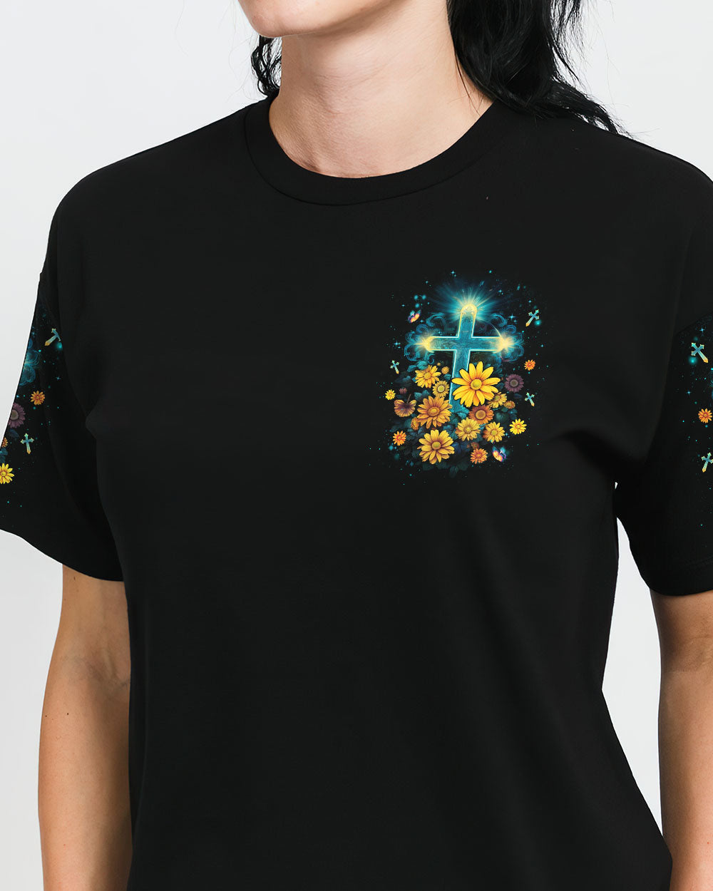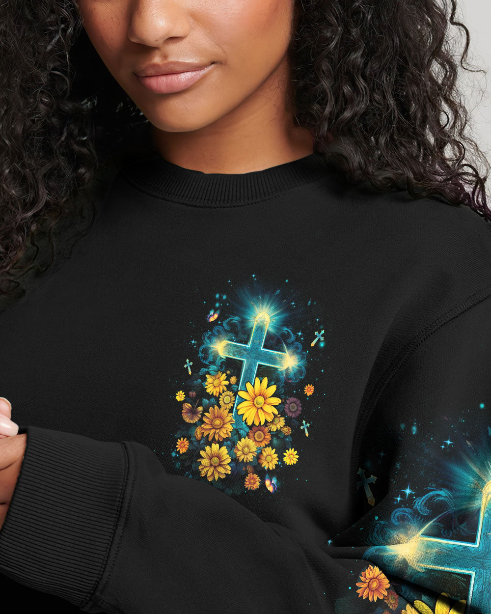 This With God All Things Are Possible Women's All Over Print Shirt features a radiant Christ design with a luminous cross adorned with sunflowers and butterflies. The profound quote, "With God all things are possible" provides a beautiful reminder of divine possibilities. Carry this symbol of faith and resilience with you and let your belief in the extraordinary shine brightly!