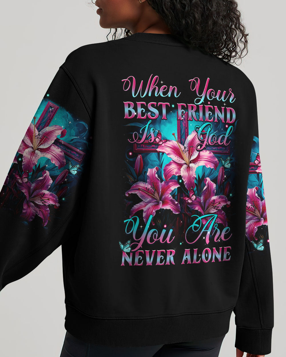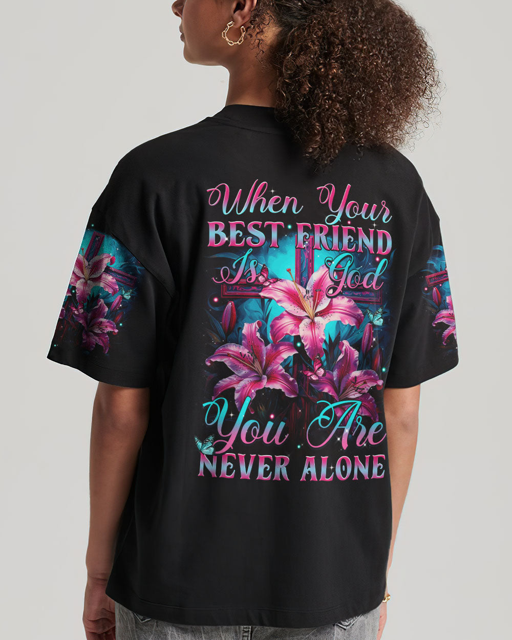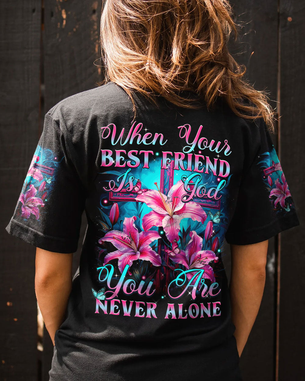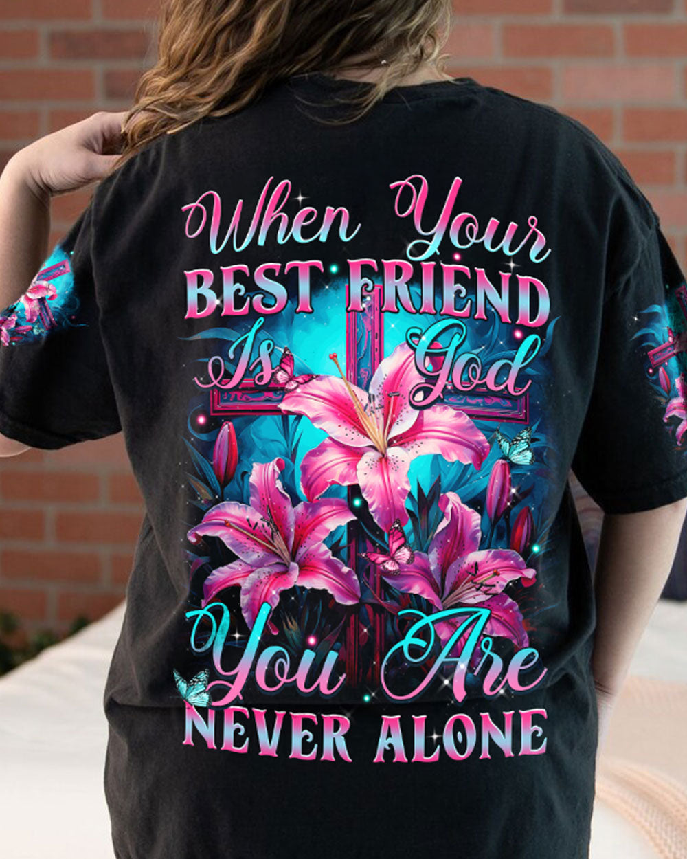 This You Are Never Alone Women's All Over Print Shirt is designed to be a powerful visual reminder of faith and God's friendship, providing strength and solace. It features crosses, lilies, butterflies, and the uplifting quote, "When Your Best Friend Is God, You Are Never Alone!" Crafted to celebrate your divine connection, this extraordinary piece will make you feel you belong, no matter the situation.