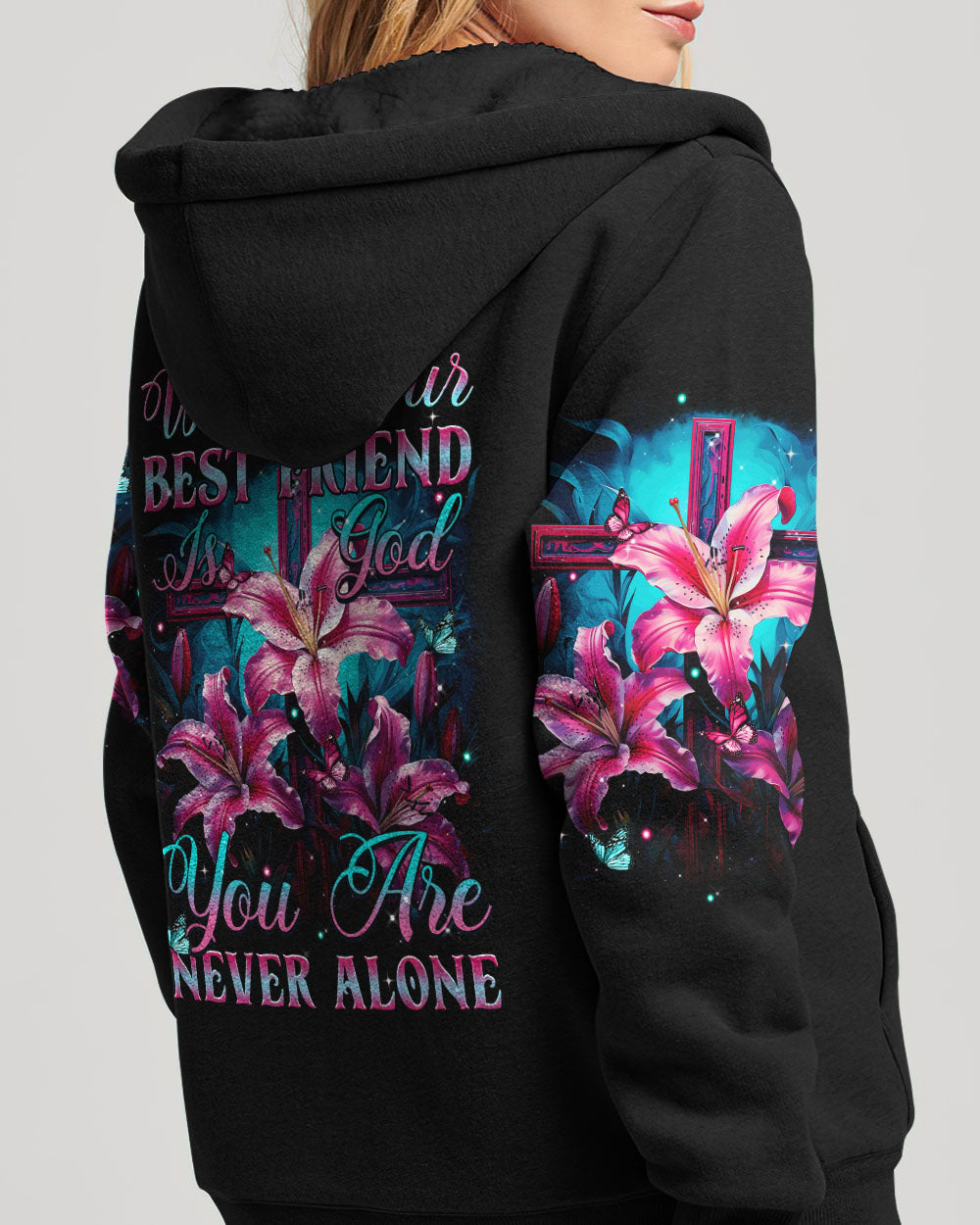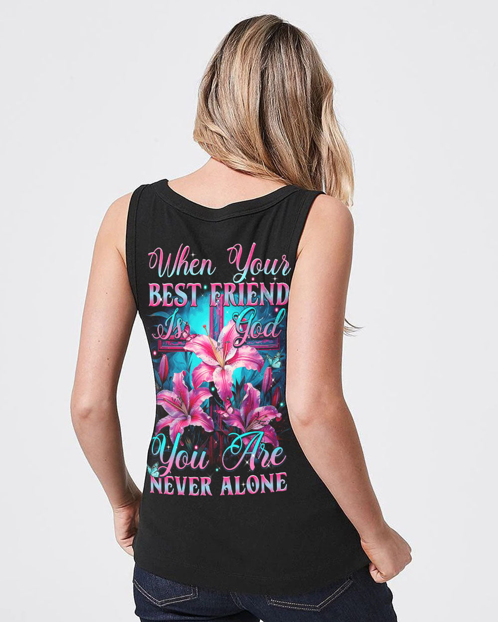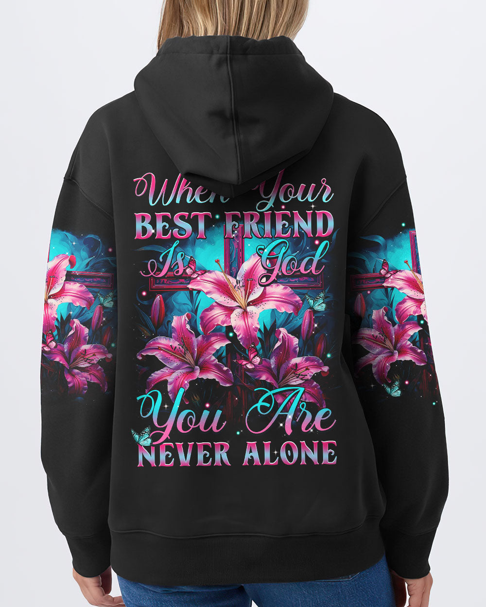 This You Are Never Alone Women's All Over Print Shirt is designed to be a powerful visual reminder of faith and God's friendship, providing strength and solace. It features crosses, lilies, butterflies, and the uplifting quote, "When Your Best Friend Is God, You Are Never Alone!" Crafted to celebrate your divine connection, this extraordinary piece will make you feel you belong, no matter the situation.