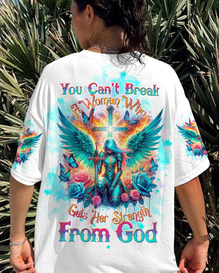 This women's all-over print shirt features a powerful image of a warrior woman, symbolizing the unwavering strength that comes from faith in God and Jesus. With the phrase "You can't break a woman who gets her strength from God," this shirt celebrates the resilience and fortitude of those who draw strength from their spiritual connection. Be inspired and feel empowered in this statement-making shirt.