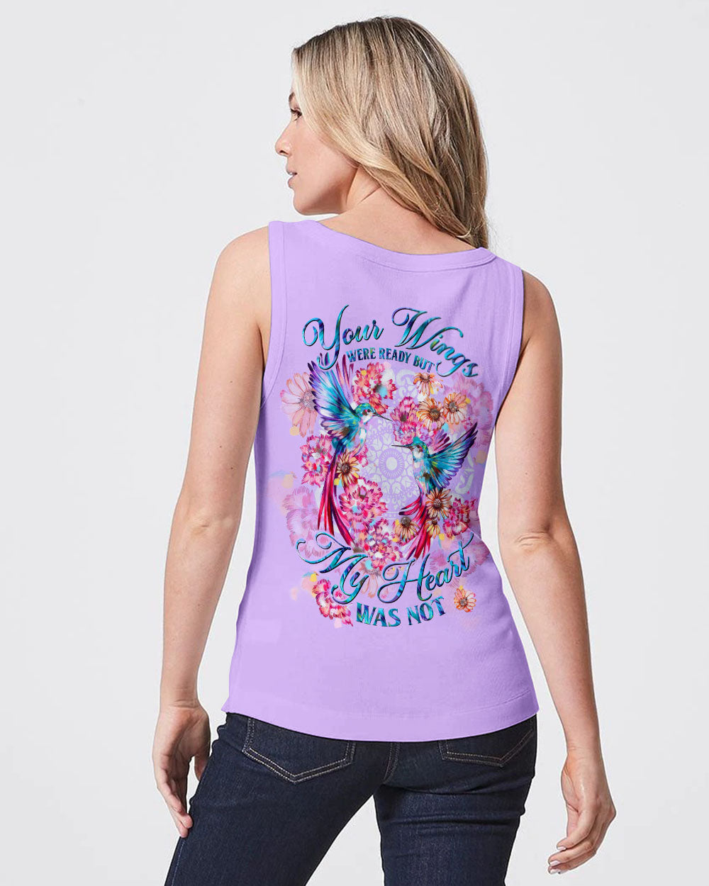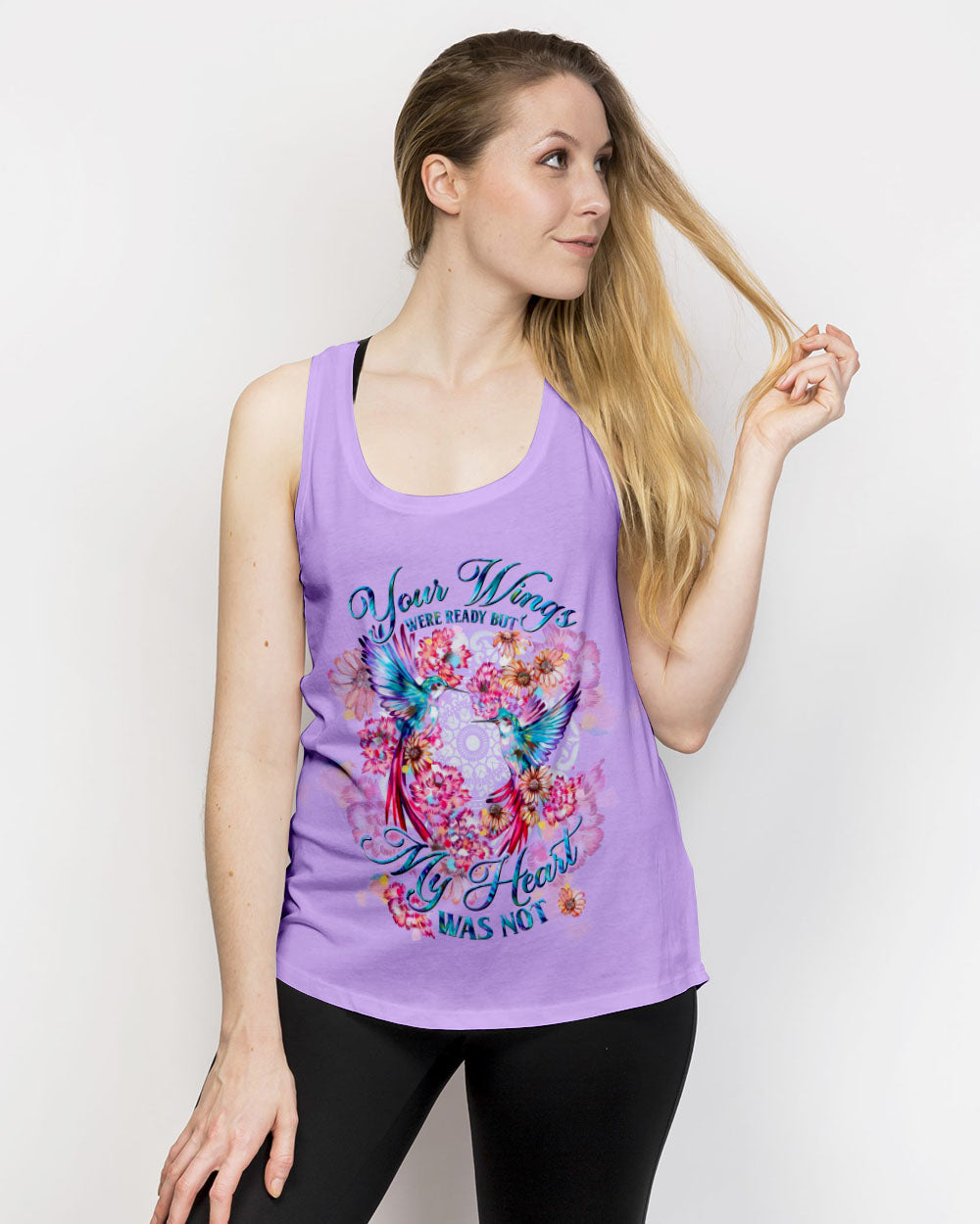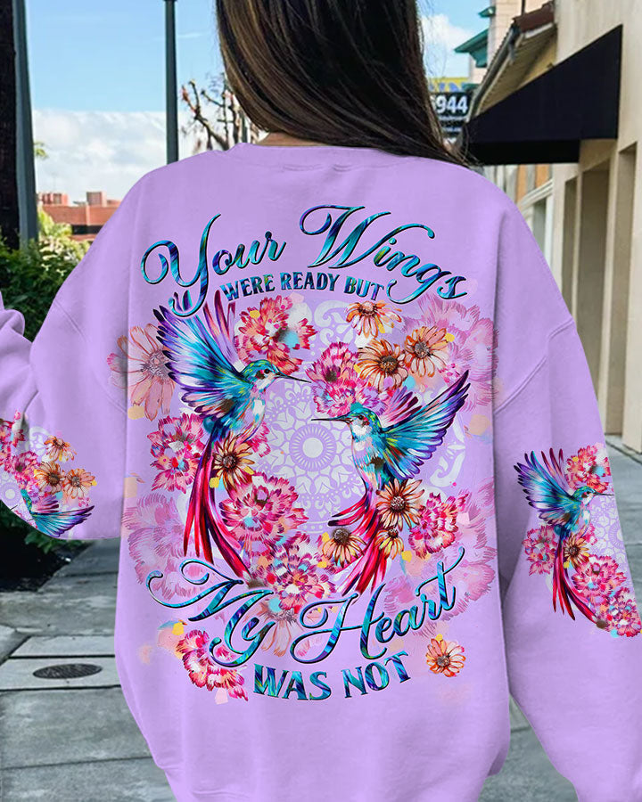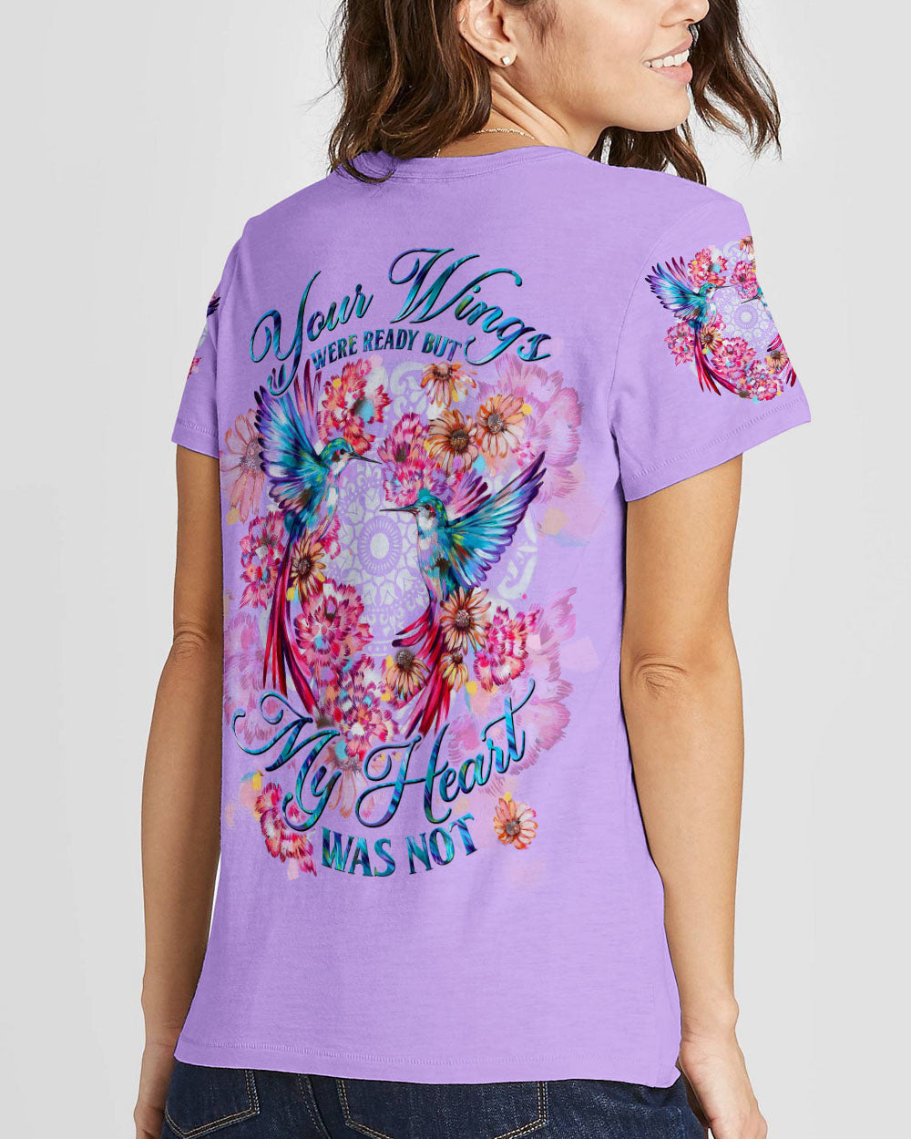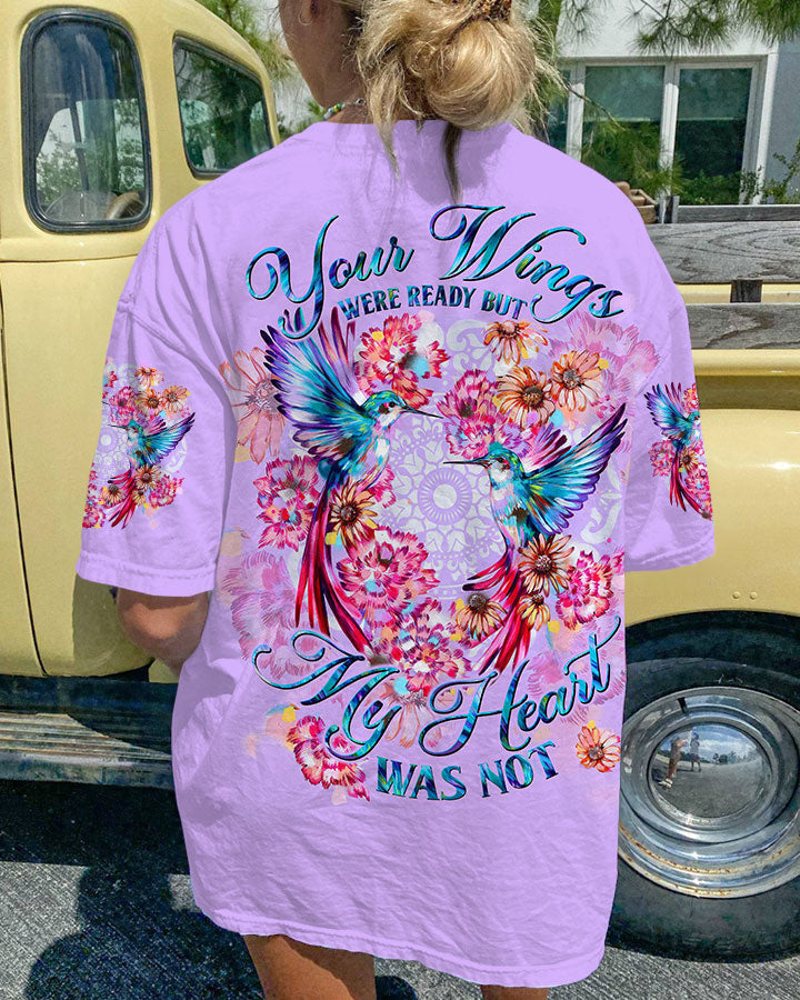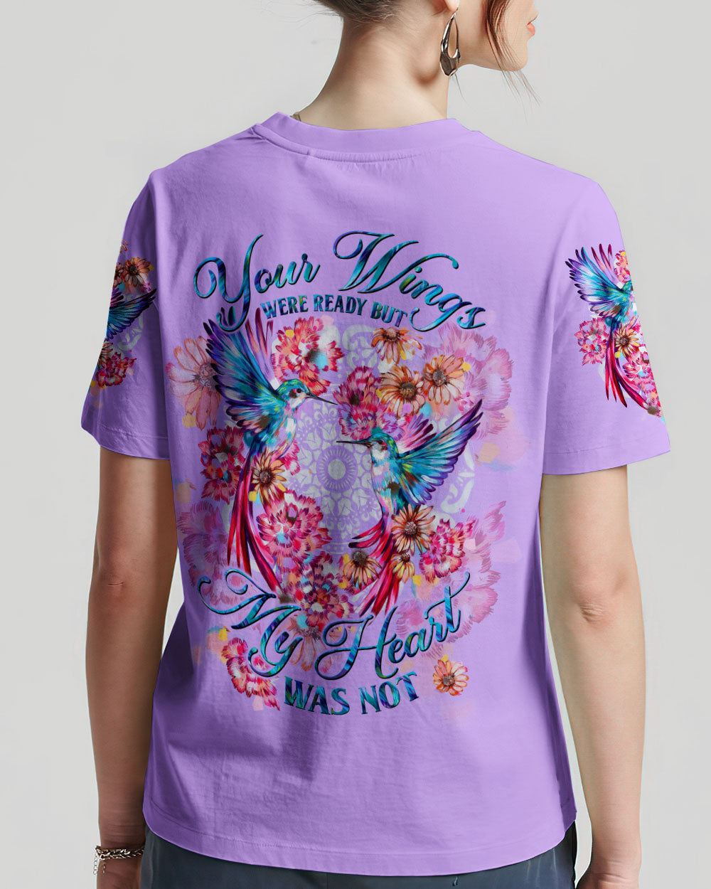 This Your Wings Were Ready Women's All Over Print Shirt is an elegant display of remembrance. The beautiful hummingbird design, framed by delicate flowers, carries the touching message, "Your Wings Were Ready but my heart was not." Wear this shirt as a stylish tribute to remember the enduring love of those dear to you whose presence lives on in your heart.